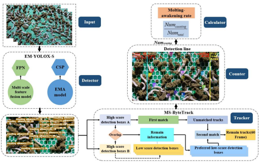 针对以上问题,团队提出了一种基于眠三角跟踪检测的小蚕眠起状态监测新方法。该方法基于优化的目标检测器实现小蚕眠三角目标的检测,在ByteTrack的基础上提出了重合检测框匹配法,解决了小蚕头部交错以及饲料遮挡导致检测框频繁切换的问题。同时,创新提出一种“检测线 ”法来解决由于小蚕活动而导致的重复计数问题,最终实现了小蚕眠起率的准确获取。使用该方法得到的眠起率趋势也与真实趋势保持高度一致。