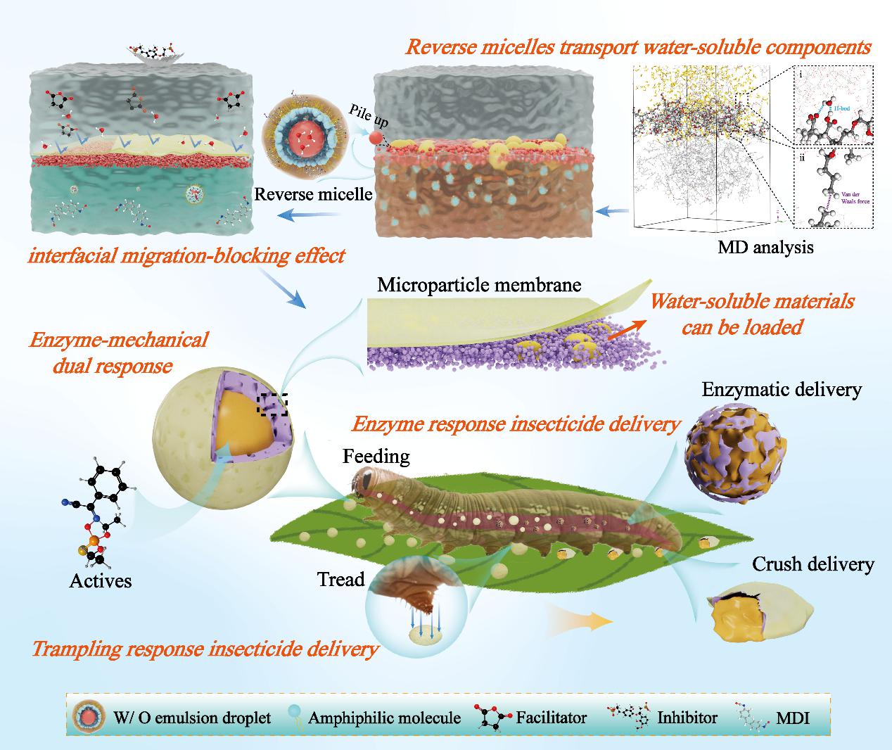 团队提出了一种基于表面活性剂胶束自组装制备农药微囊的新策略:基于现有的界面聚合微囊化技术原理,首先利用反胶束“运送”水分子在油/水界面上形成微粒层,在其表面再生成一层致密薄膜,从而构建出类似动物细胞膜的仿生界面膜结构囊壳。这种特殊囊壳不仅可以负载水溶性活性物质,还可以在害虫取食(消化酶作用)和爬行(机械压力)的刺激下实现智能响应释放(图1)。