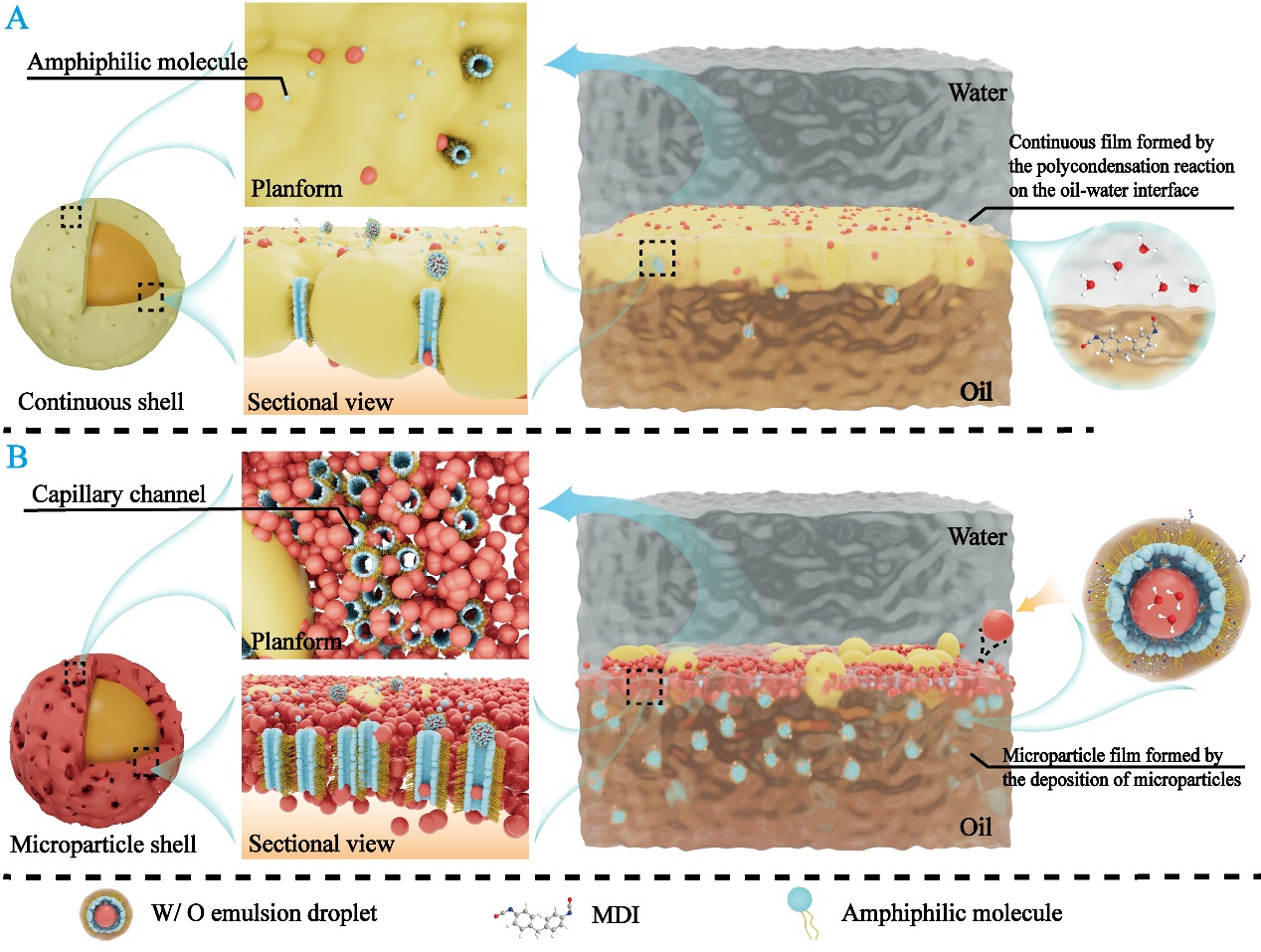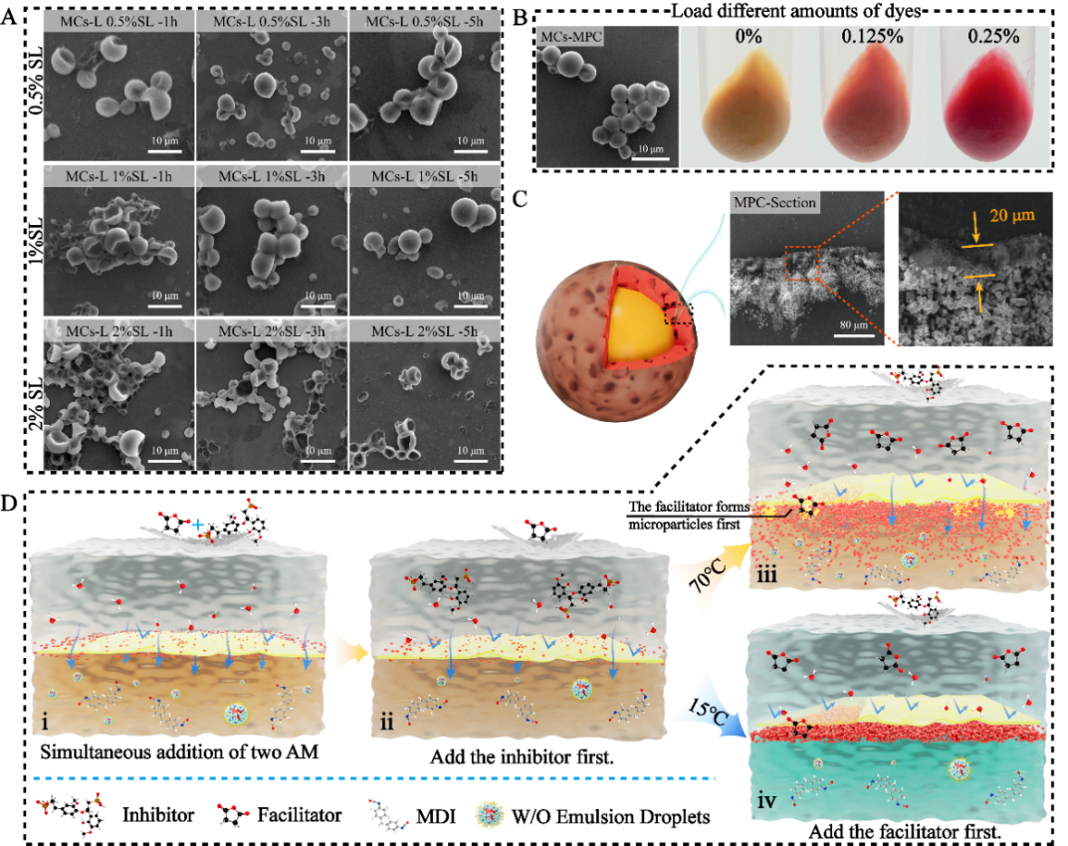 该研究系统揭示了在界面聚合过程中表面活性剂类两亲分子对水相传质和囊壳结构的关键调控作用。研究发现,聚羧酸盐(PCE)可形成反胶束,将水相以乳滴形式跨界面输运至油相,进一步,乳滴中的水与异氰酸酯反应生成微米级颗粒,最终形成多孔的“微粒型”界面膜;而木质素磺酸钠(SL)作为两亲分子时,界面缩聚过程则倾向于形成致密连续的界面膜(图2)